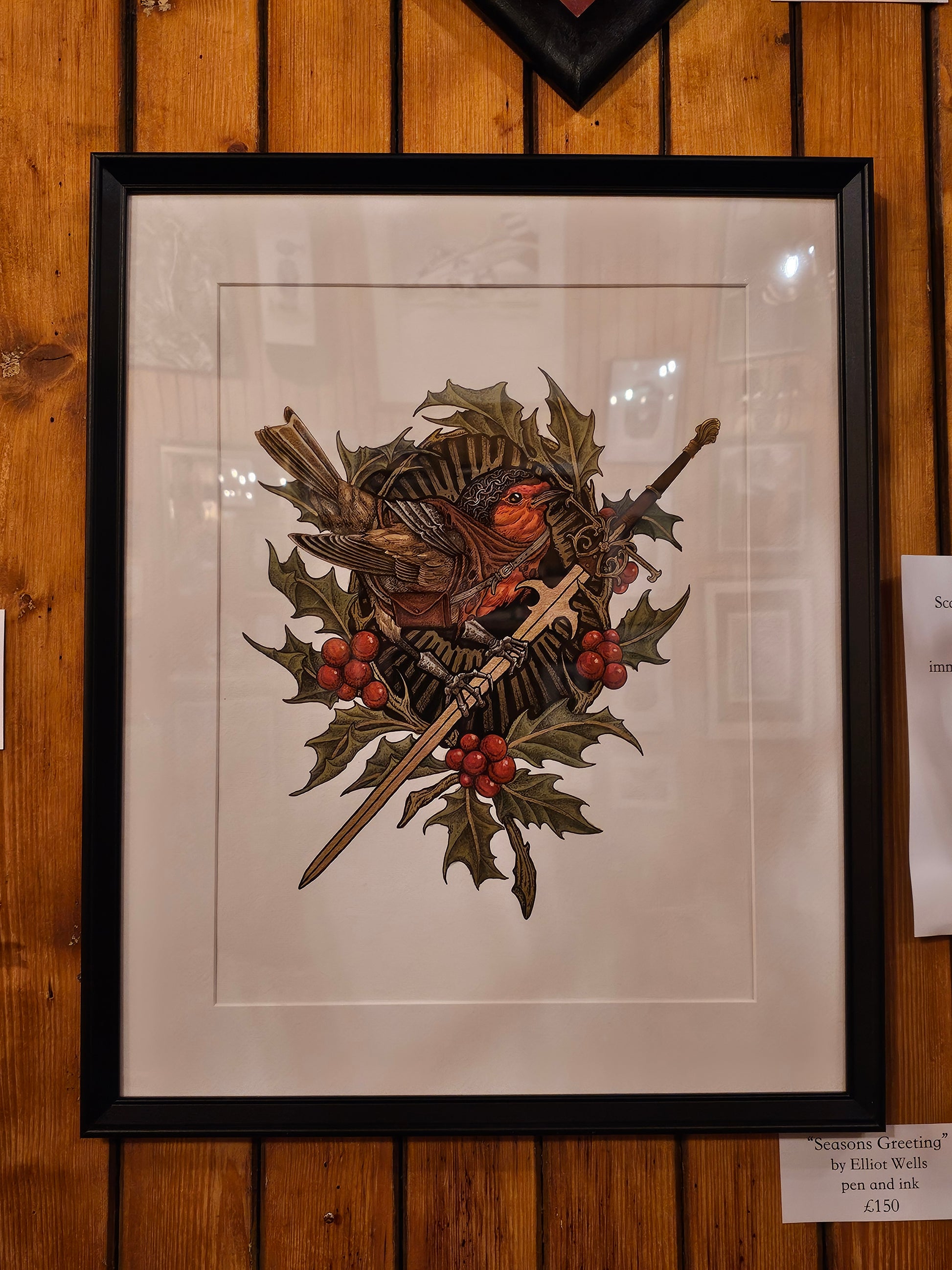 Pen and ink. Please leave contact details if you aren't taking artwork immediately.